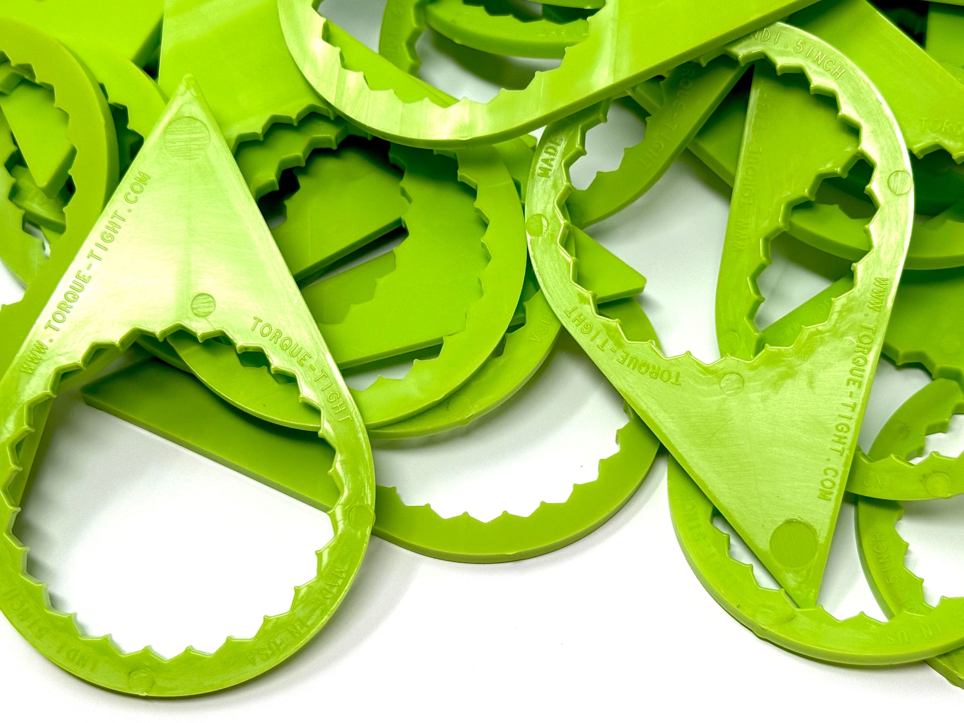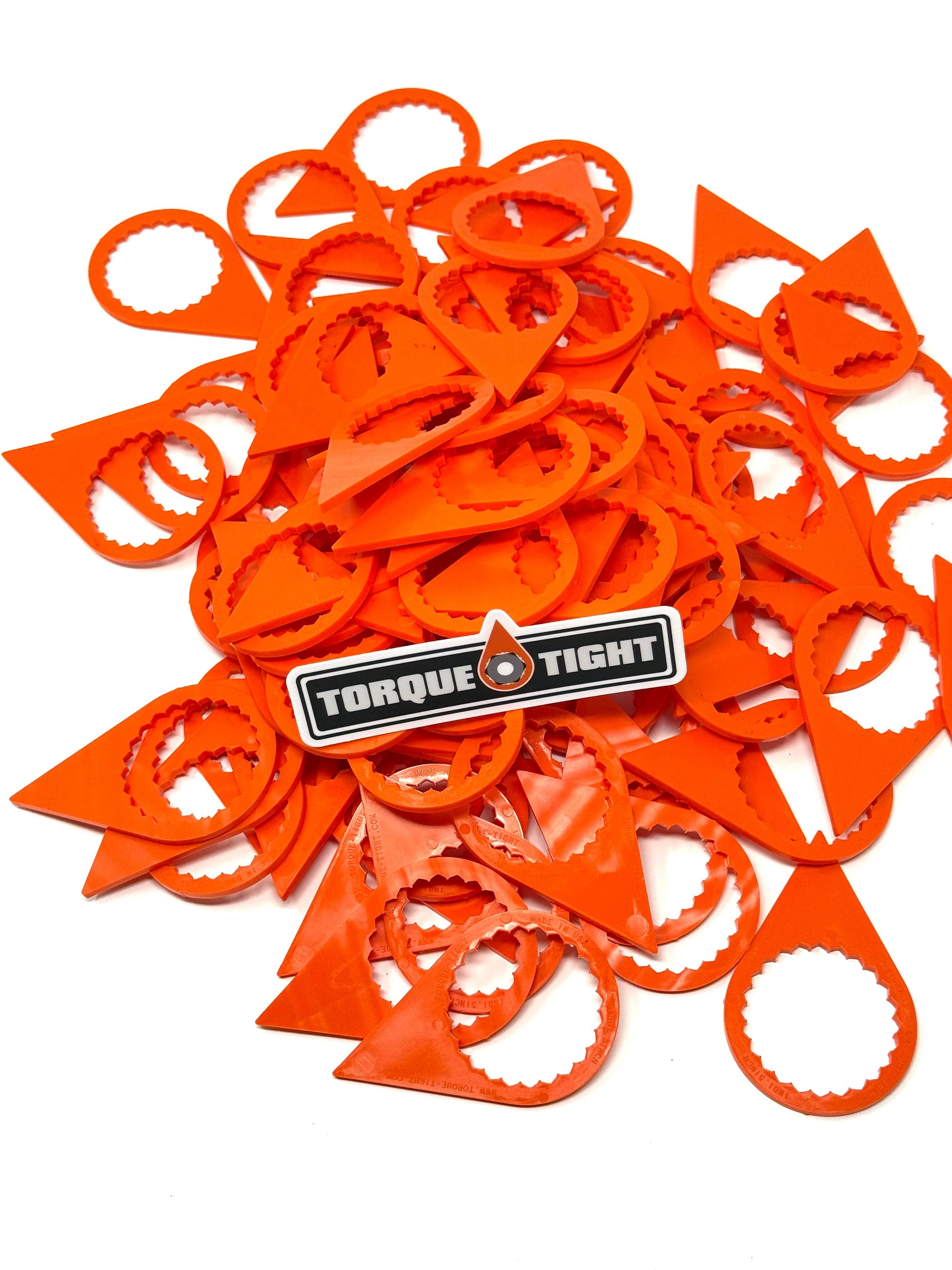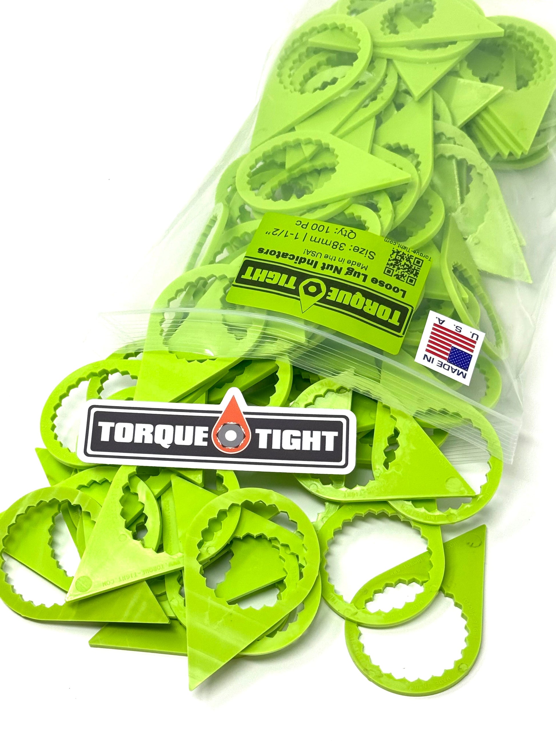 Torque-Tight™ indicators are a small plastic piece that is cut to a teardrop shape, then a 24 point section of teeth are cut to in the shape of a circle that create an interference fit on a standard Hex Nut. Torque-Tight™ indicators are designed to be much larger (more than 2x in fact) than our competitors, this allows for a blatant visual reference when performing a walkaround. Our Torque-Tight™ indicators come in 3 standard colors, Green, Orange, and Black, however they are available in any color you can imagine (with a minimum order). For less than $25 you can reduce the risk of wheel off accidents, and heck, you may even save a few lives in the process.